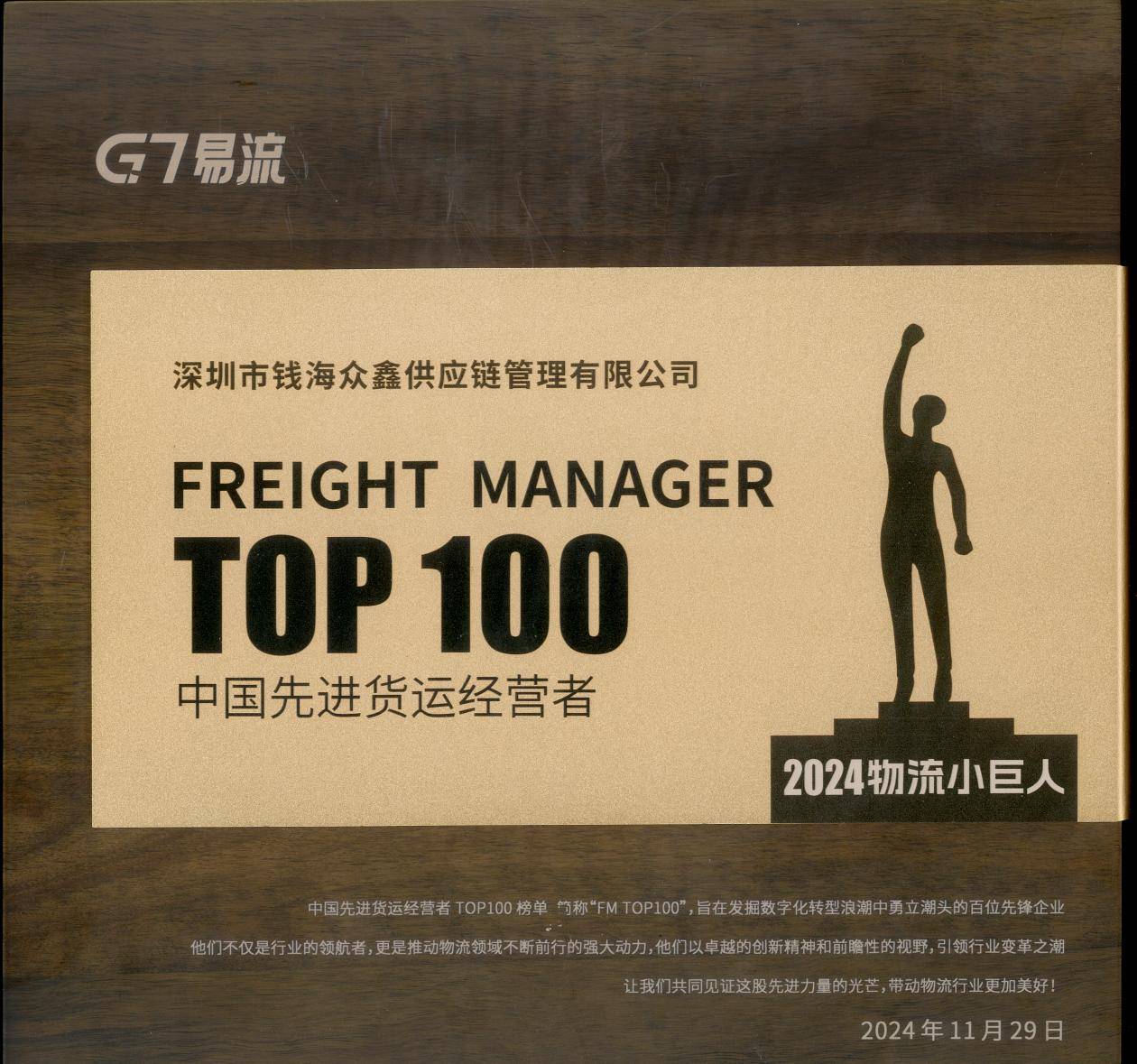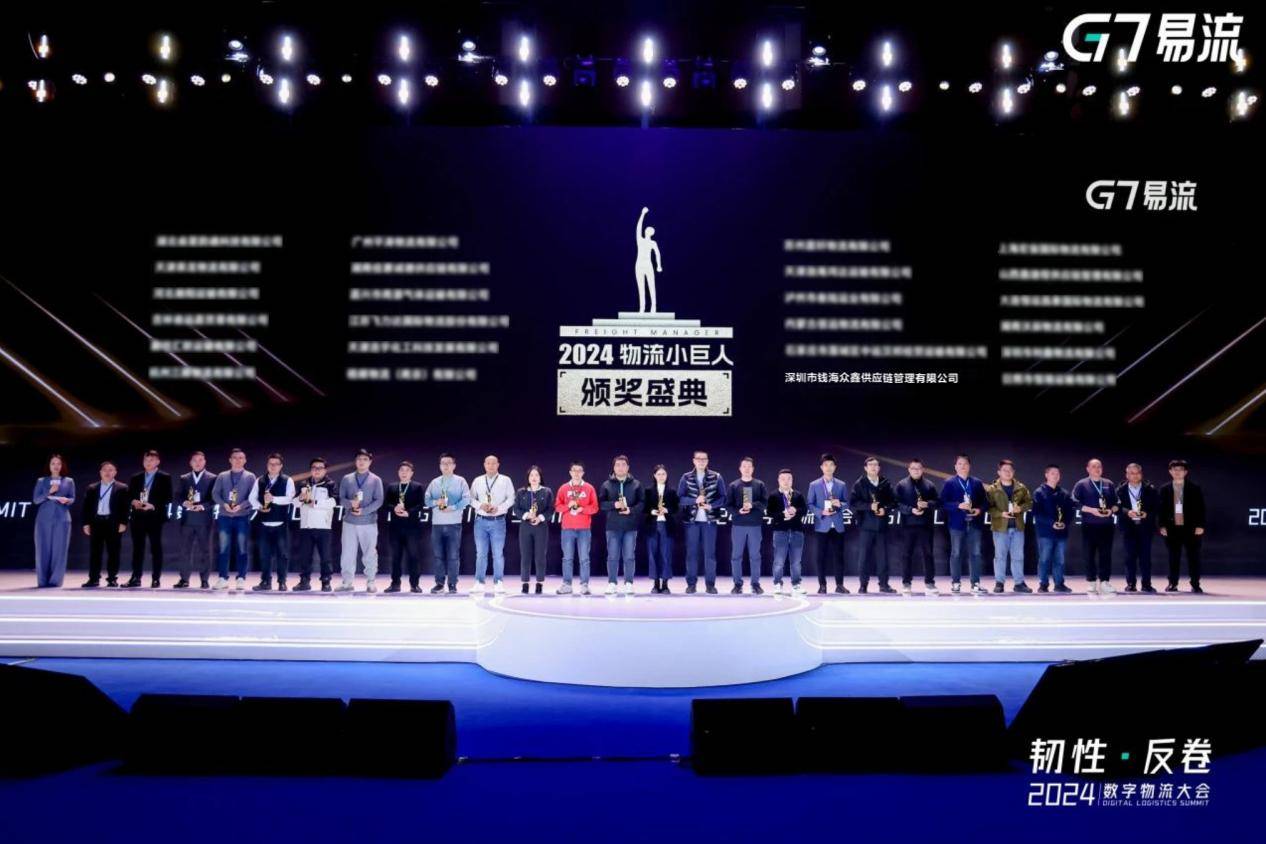 2024年11月28日至30日,以“韧性・反卷”为主题的2024数字物流大会在天津国家会展中心盛大举行,会议聚焦大型生产资料物流变革、新能源场景造车、基于AI的场景智能等物流新质生产力领域。吸引全国2000余位物流行业人士齐聚天津,共襄盛会。深圳市钱海众鑫供应链管理有限公司(文中简称:钱海众鑫供应链集团)凭借丰富的行业经验荣获“物流小巨人”2024中国先进货运经营者TOP100,于行业巅峰熠熠生辉。